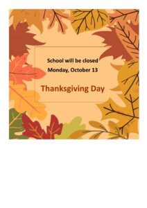- Monday, October 13th – Thanksgiving Day – School is CLOSED